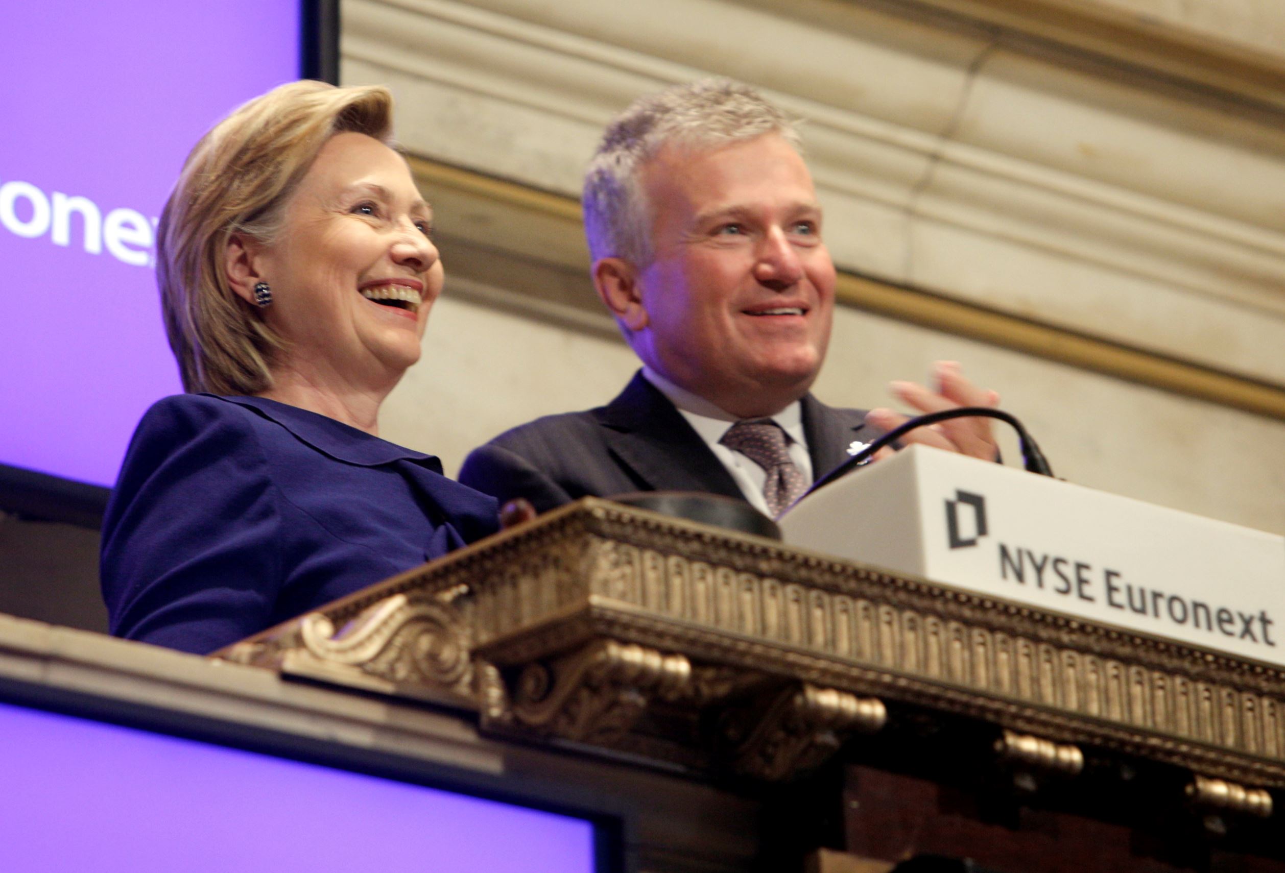 WASHINGTON (AP) — Television cameras rolled when Hillary Clinton appeared on the central balcony of the New York Stock Exchange to ring the opening bell — just minutes after she attended a private breakfast in September 2009 with influential Wall Street and business leaders.
