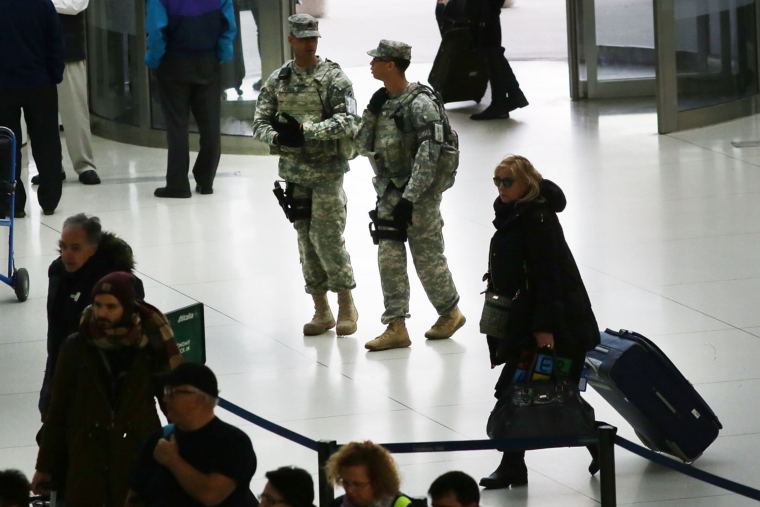 The Port Authority of New York and New Jersey said Tuesday that travelers should expect to see officers with tactical weapons patrolling at New York's John F. Kennedy and LaGuardia airports and at New Jersey's Newark International Airport.